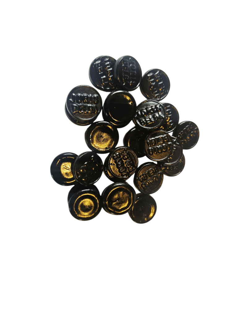 arabische gom, suiker, glucosestroop, natuurlijke aroma’s, zoethout, kleurstof (carbo medicinalis vegetabilis), glansmiddel (stoom).